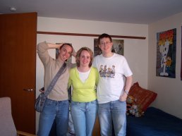 After the excitement of yesterday's VE day celebrations, Naomi has just set off home following her flying visit. It was great to see her again, and we had a nice chat last night, and also this afternoon, after I returned from my morning of lectures. I managed to get a photo of the three of us (Matt, Naomi and me, from left to right), before she left: