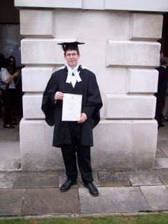 After getting changed, we assembled in front court for the graduation photo, then had a short rehersal with the praelector, before processing into town. Despite being very hot and uncomfortable, this was really quite fun - we provided quite the spectacle for the tourists, and completely stopped the traffic on Queens Road, while we crossed. Once we arrived at Senate House, we had to go up in order and kneel down in a praying position, whilst the praelector recommended us for degree (in latin), and the warden (in his heavy red Santa suit) did his hand-clasping thing, and sent us off. So, I now officially have my degree :-)