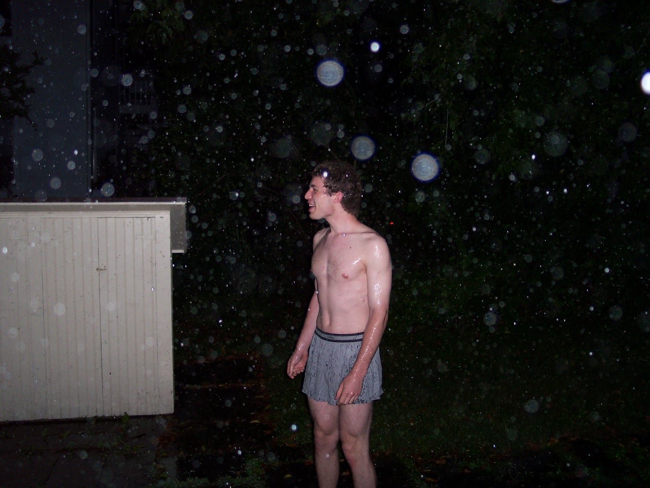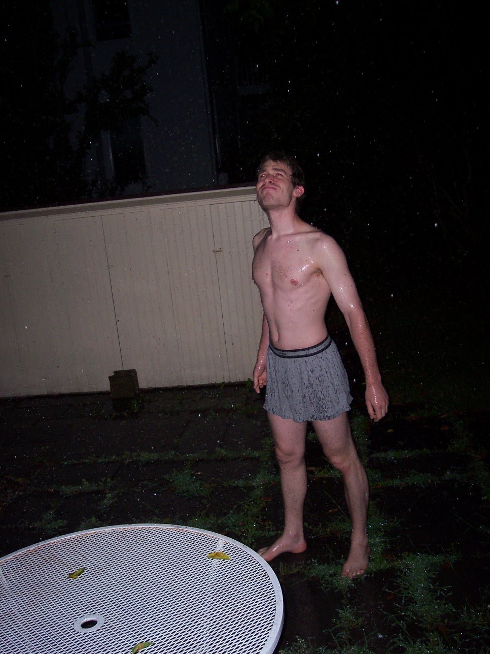 When we got back from the supermarket, it started raining in earnest. This was of no concern to John, however, who decided that since he was going to have a shower, he might as well take advantage of the forces of nature.