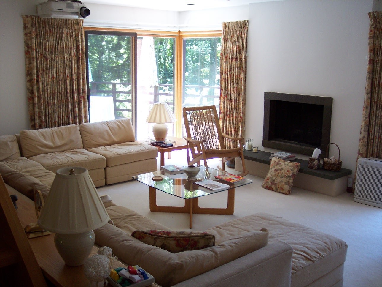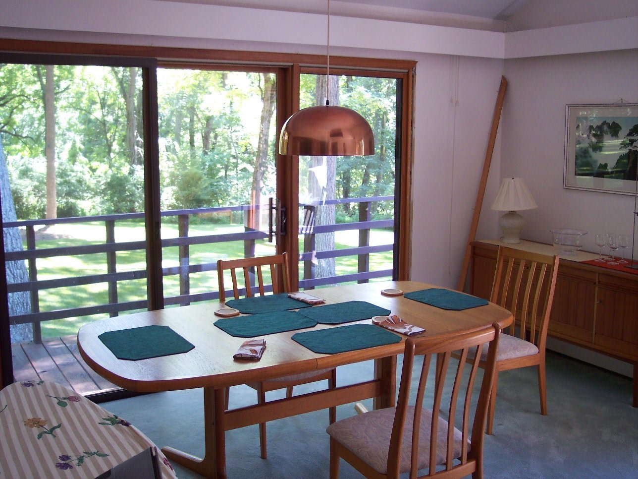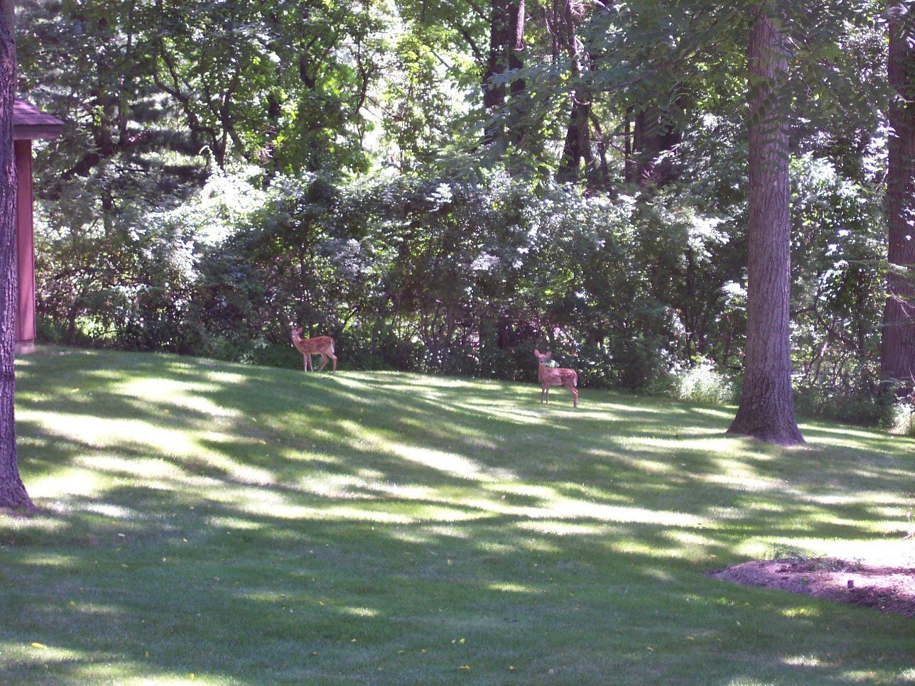 The house is situated in the middle of some woodland (they have about 9 acres of land), and there's a veranda round the back, with lovely views over the woods, that go down to a small stream. There's a lot of trouble in that area with deer, since they damage the foliage, eat the saplings, etc, but it does have the advantage that you often see them, right in the back garden.